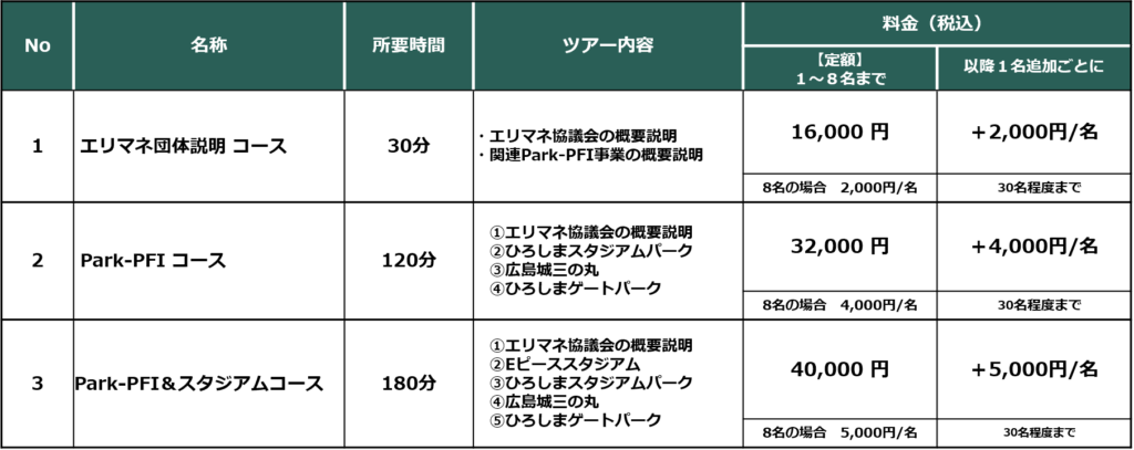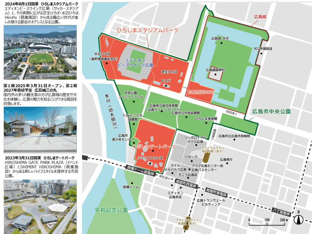 広島市中央公園エリアマネジメント協議会の概要説明や公募設置管理制度Park-PFI(パークピーエフアイ)事業で整備されたひろしまゲートパーク(2023年3月開業)、ひろしまスタジアムパーク(2024年8月開業)、広島城三の丸(2025年3月第1期エリアオープン)に加え、サッカー専用スタジアム エディオンピースウイング広島(2024年2月開業)を視察することができる3つのコースをご用意いたしました。